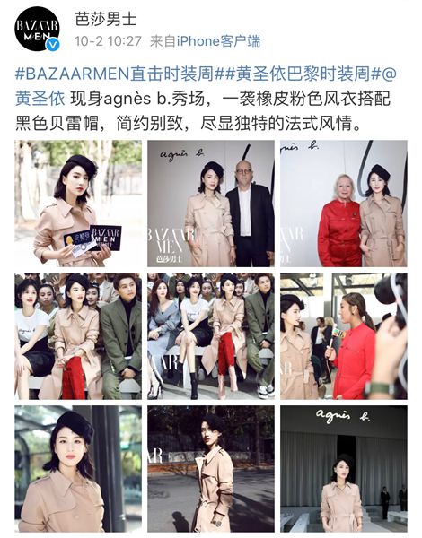 芭莎男士官方微博发布多张高清大图,对黄圣依在agnès b.秀场的动态进行了现场直击和深度报道。