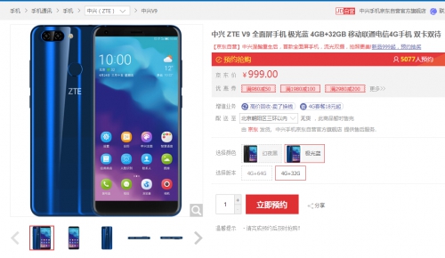 看了这么多是不是想分分钟入手一台中兴Blade V9。即日起登入京东商城中兴旗舰店即可购买,4GB+32GB版本预约价格为 999 元,4GB+64GB版本预约价格 1199 元,高配版本立减 100 元。